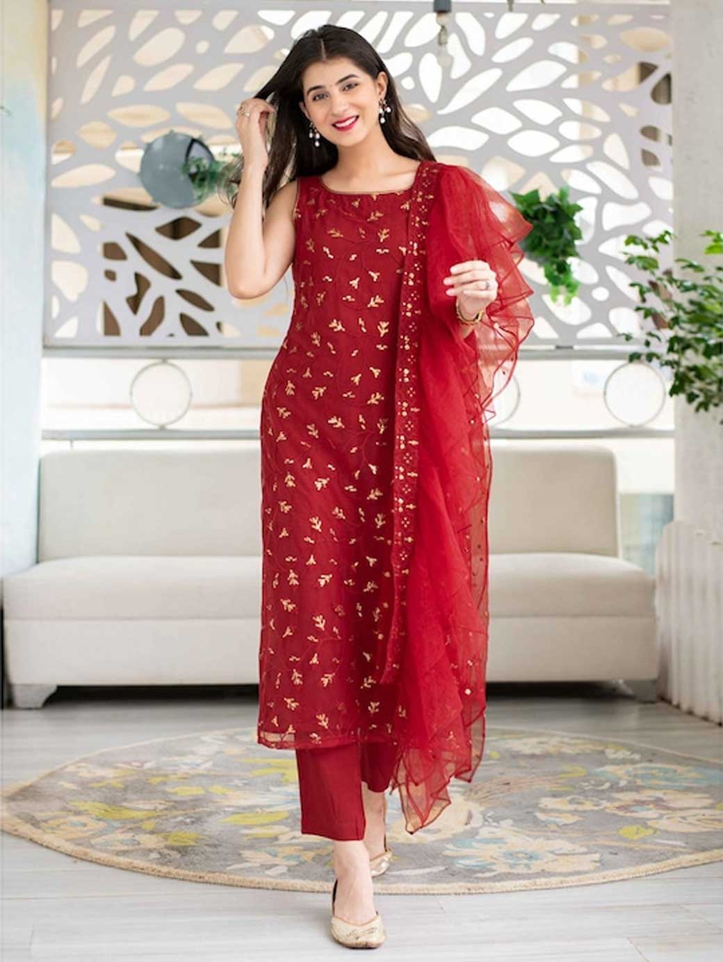 Top Length : 42 ( Inch) ||Top Width Size : 58 ( Inch) || Bottom Length : 2.2 MTR || Duptta Length : 2.25 MTR|| Inner Length Fit : Regular