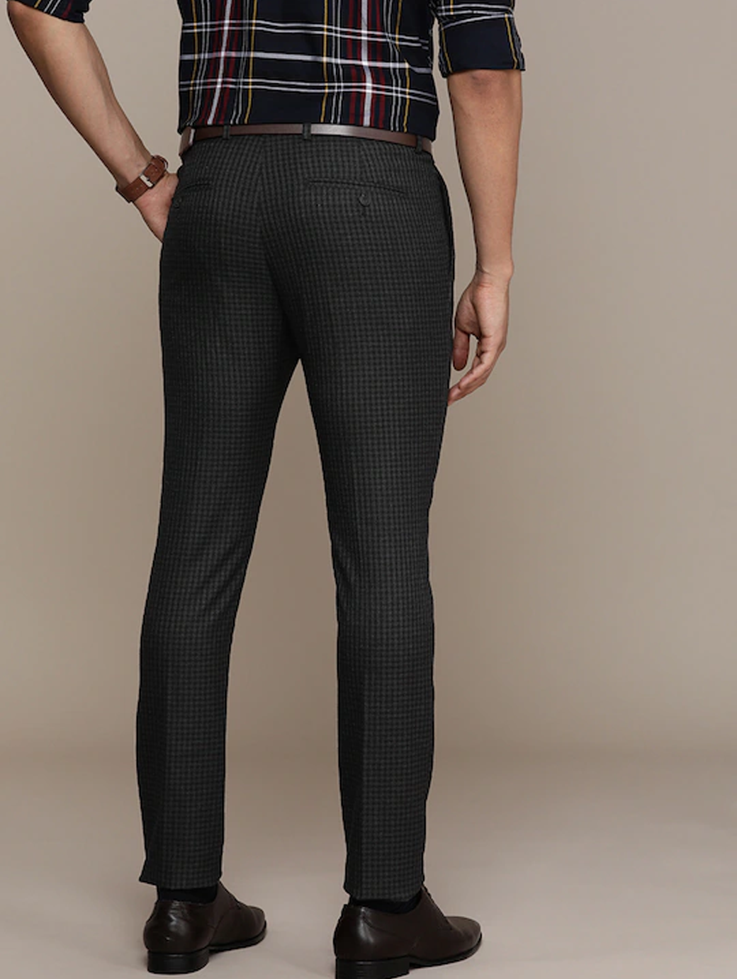 Men Black & Grey Checked Slim Fit Pleated Formal Trousers