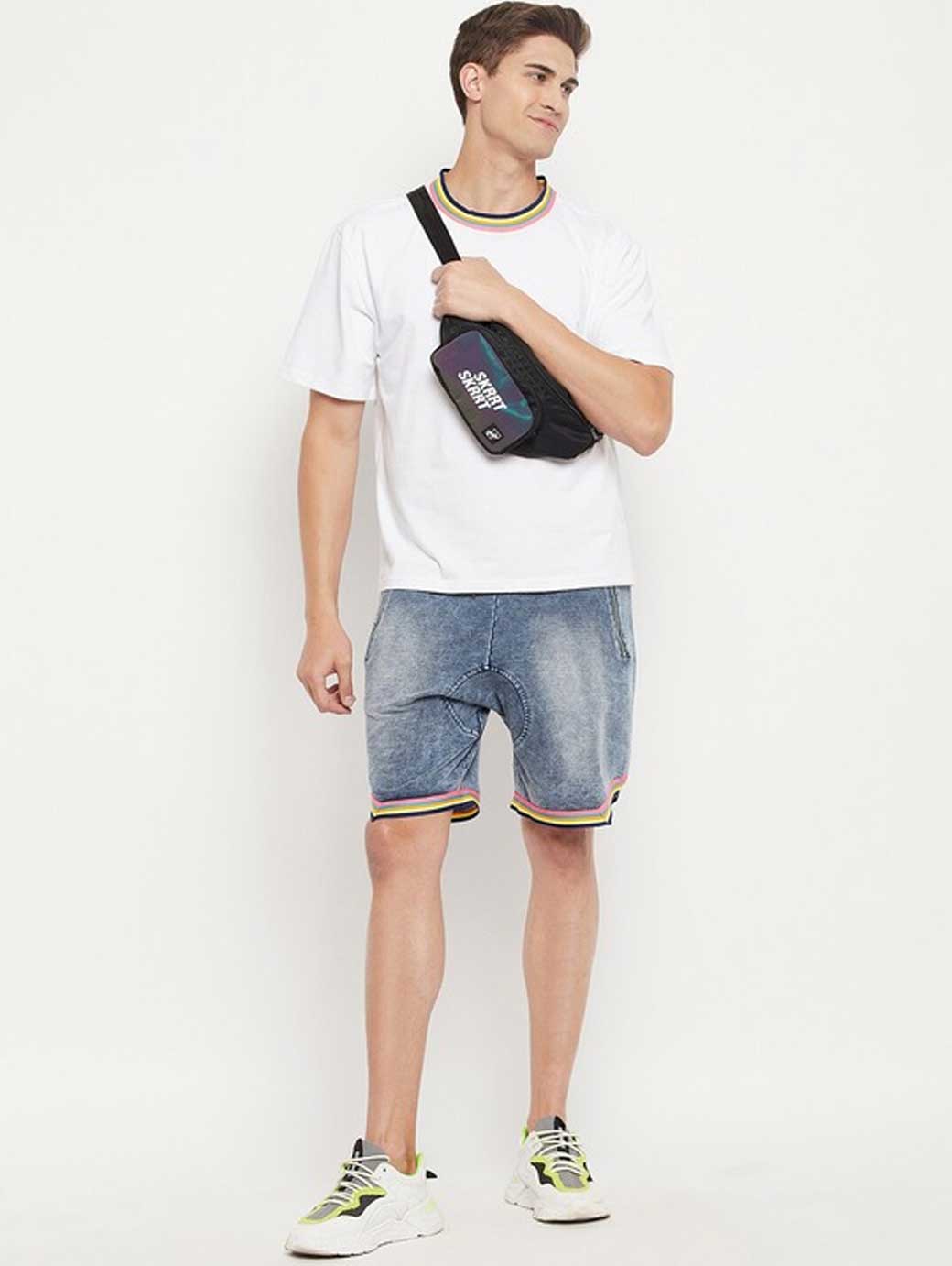Blue washed mid-rise denim shorts, has 2 pockets, drawstring closure