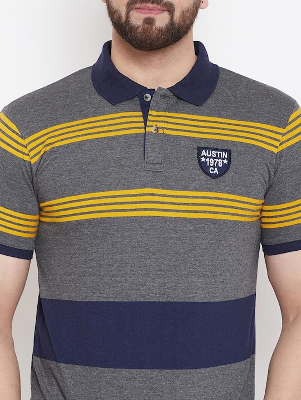 Grey and Navy Blue striped T-shirt, has a polo collar, and short sleeves