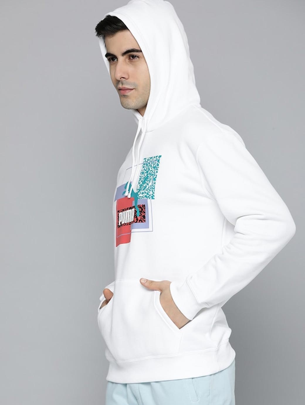 Features: White printed sweatshirt has a hood 1 pocket, long sleeves Regular fit Hood with flat drawcord for an adjustable fit Kangaroo pocket for storage solutions Ribbed cuffs and hem Multi-coloured PUMA branding on chest Woven loop label on back of hem PRODUCT STORY : Sport-inspired but designed for the city life, our Brand Love collection looks stands out in every situation. This hoodie is no exception.