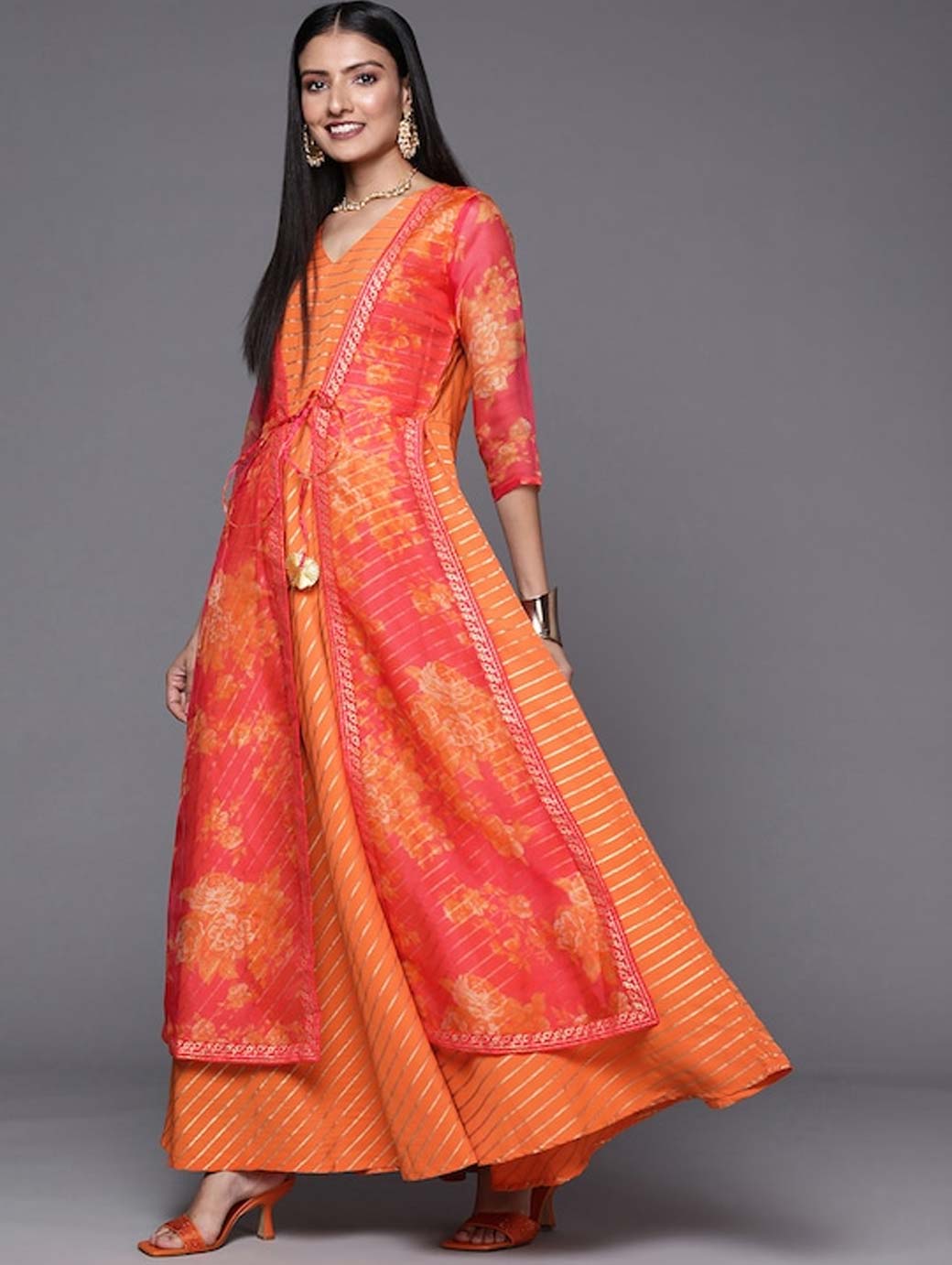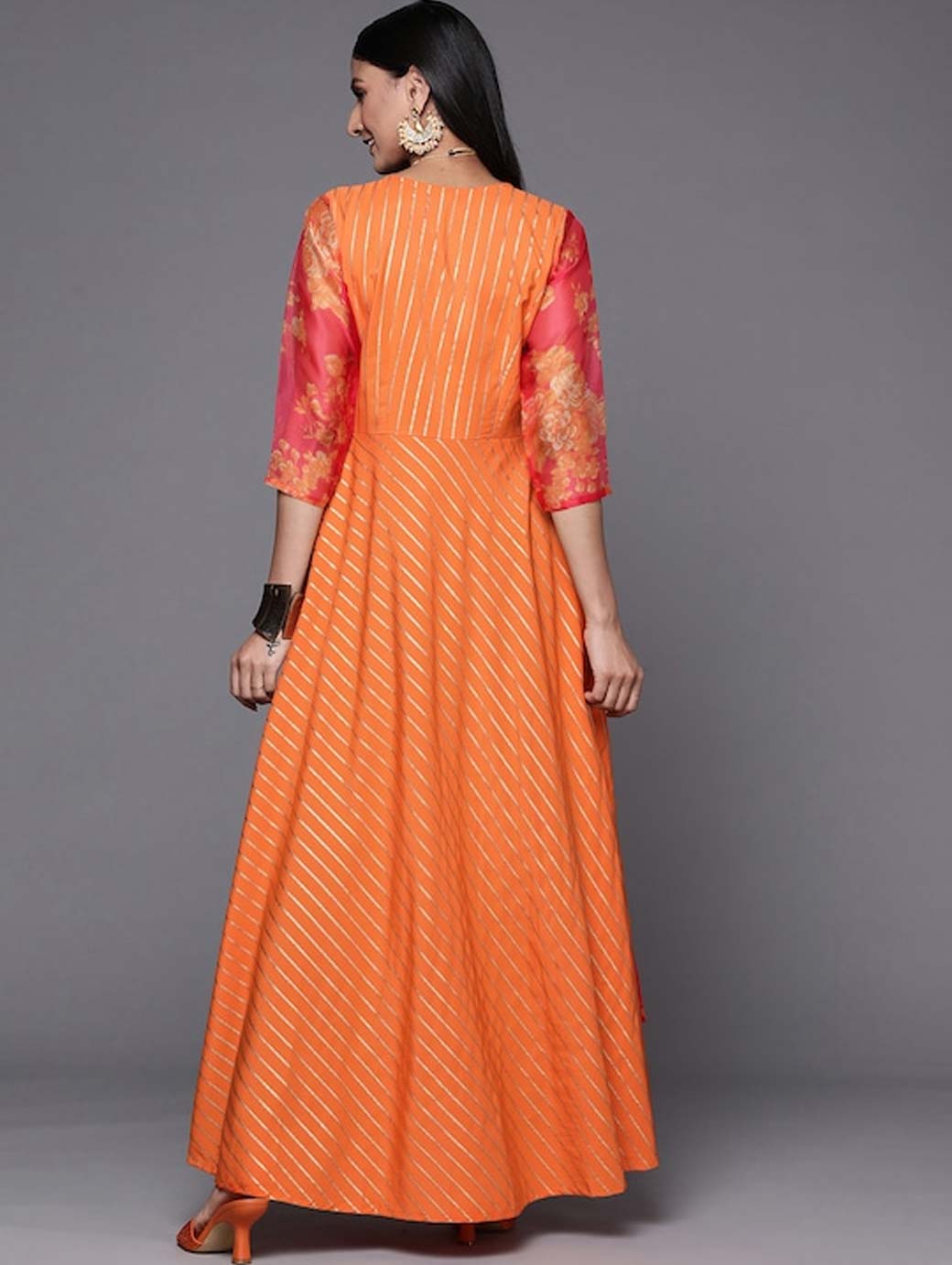 Orange striped maxi dress Has an attached floral print shrug with tie-up detail V-neck Three-quarter, regular sleeves Maxi length in flared hem Crepe fabric