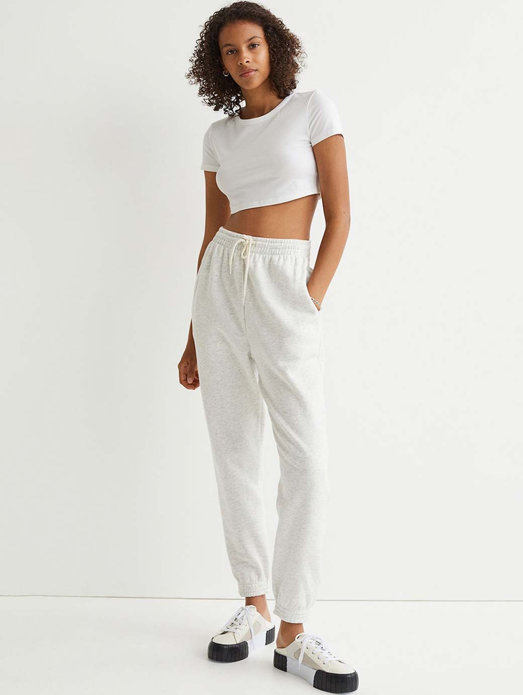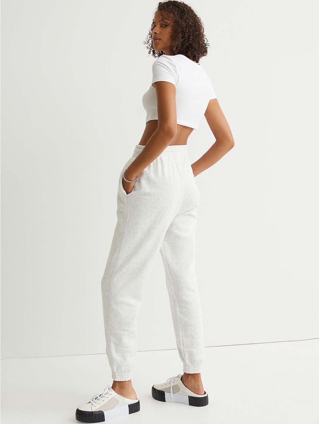 Joggers in soft sweatshirt fabric. High waist with smocked elastication and a drawstring, side pockets and gently tapered legs with smocked elastication at the hems.