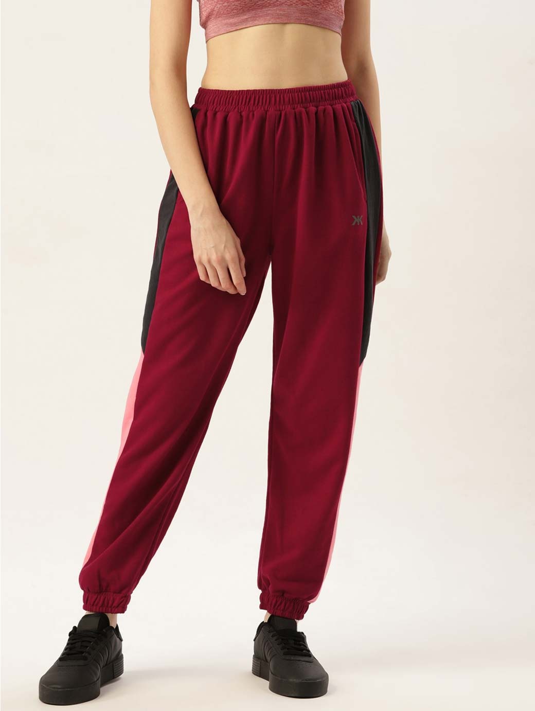 Maroon solid side striped joggers, has elasticated waistband with drawstring closure, 3 pockets and cuffed hem