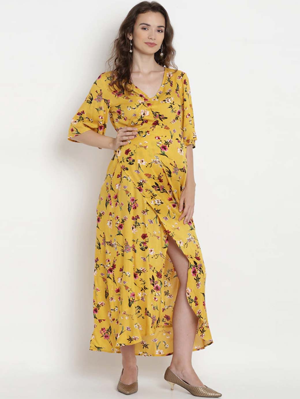 Women Yellow Printed Maternity Wrap Dress