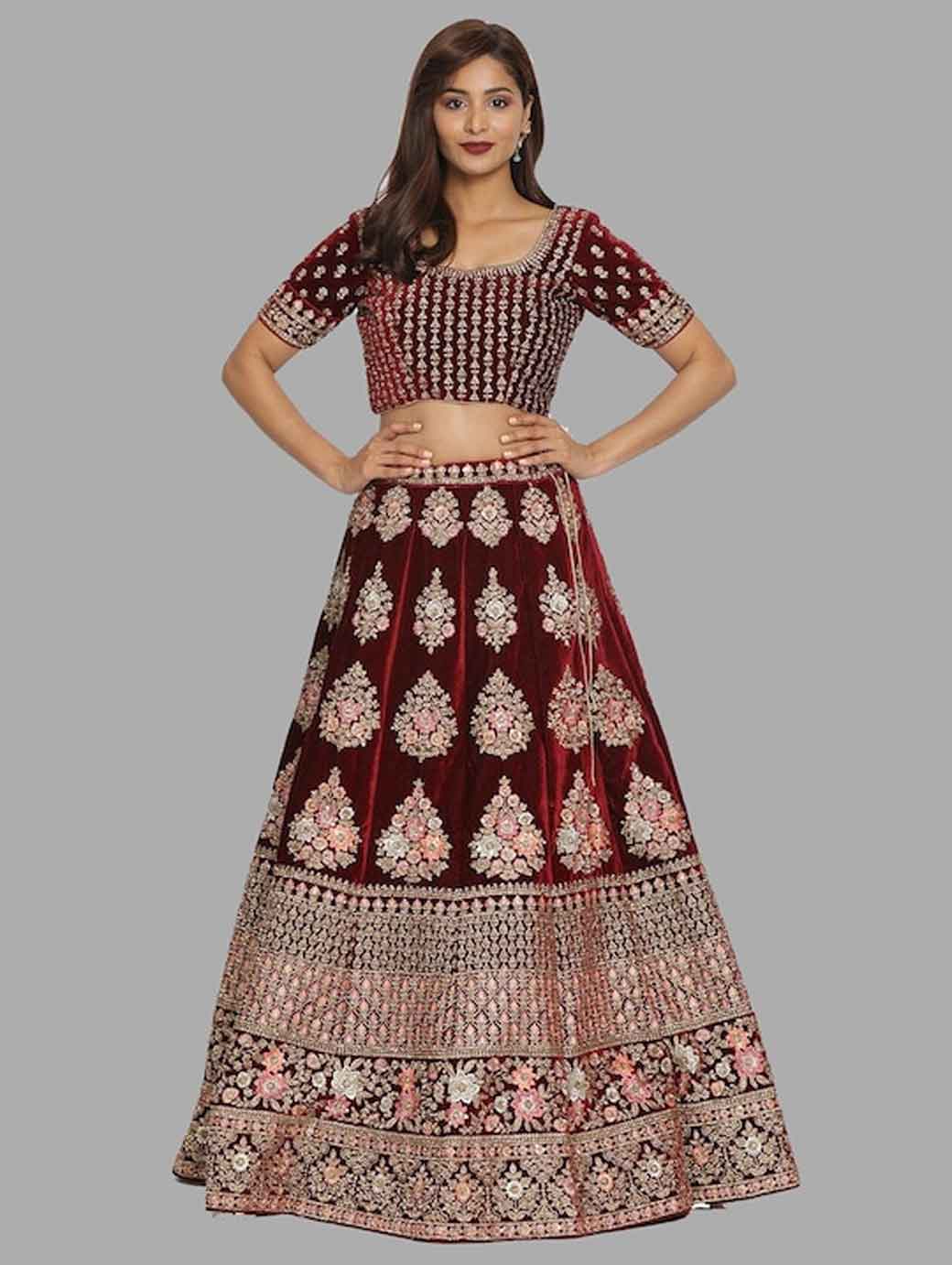 Maroon and gold-toned embroidered lehenga choli with dupatta,