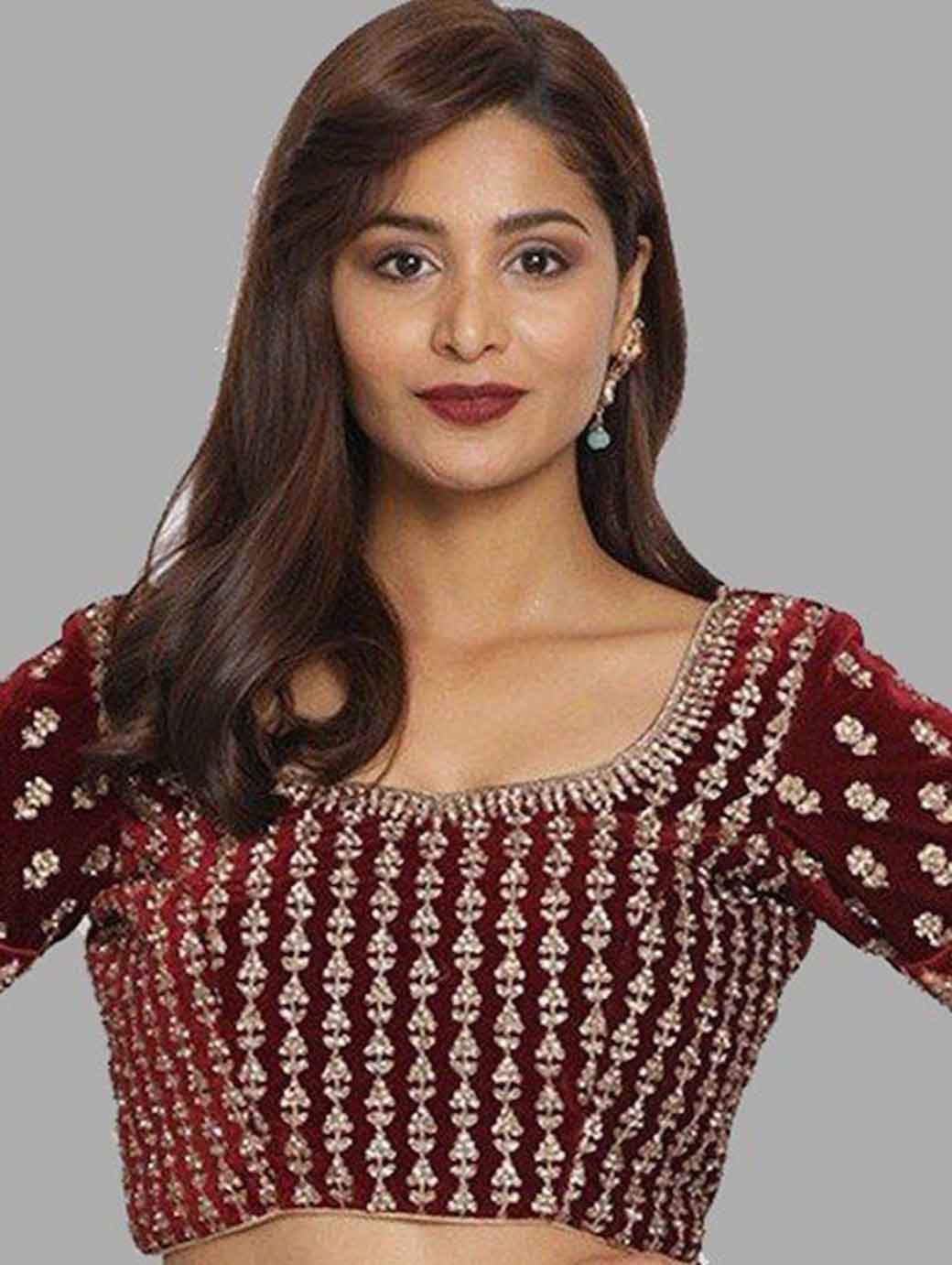 Maroon and gold-toned embroidered unstitched blouse, has a round neck, short sleeves, maroon and gold-toned embroidered semi-stitched lehenga, flared hem Maroon and gold-toned embellished dupatta, solid border
