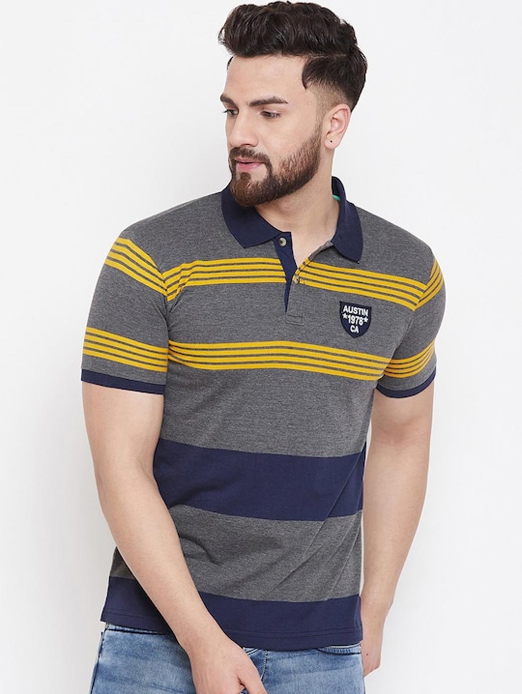 Grey and Navy Blue striped T-shirt, has a polo collar, and short sleeves