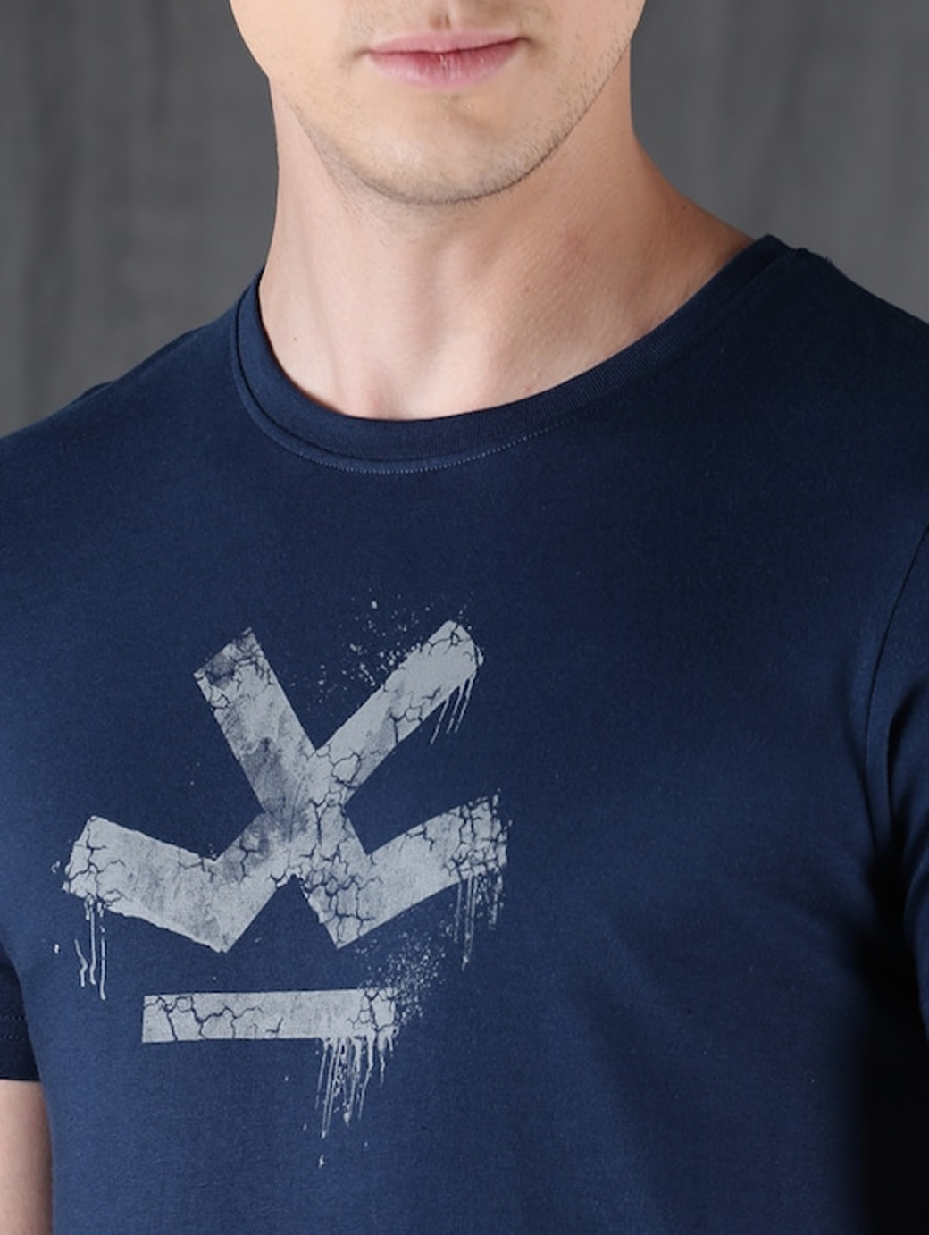 Navy Blue printed T-shirt, has a round neck, short sleeves