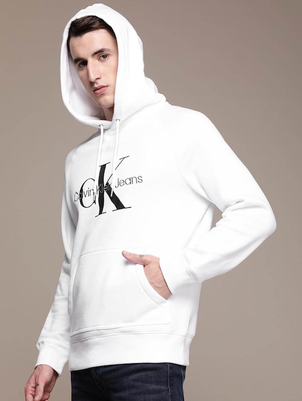 White printed sweatshirt has a hood, 2 insert pocket pockets, long sleeves, closure, ribbed hem