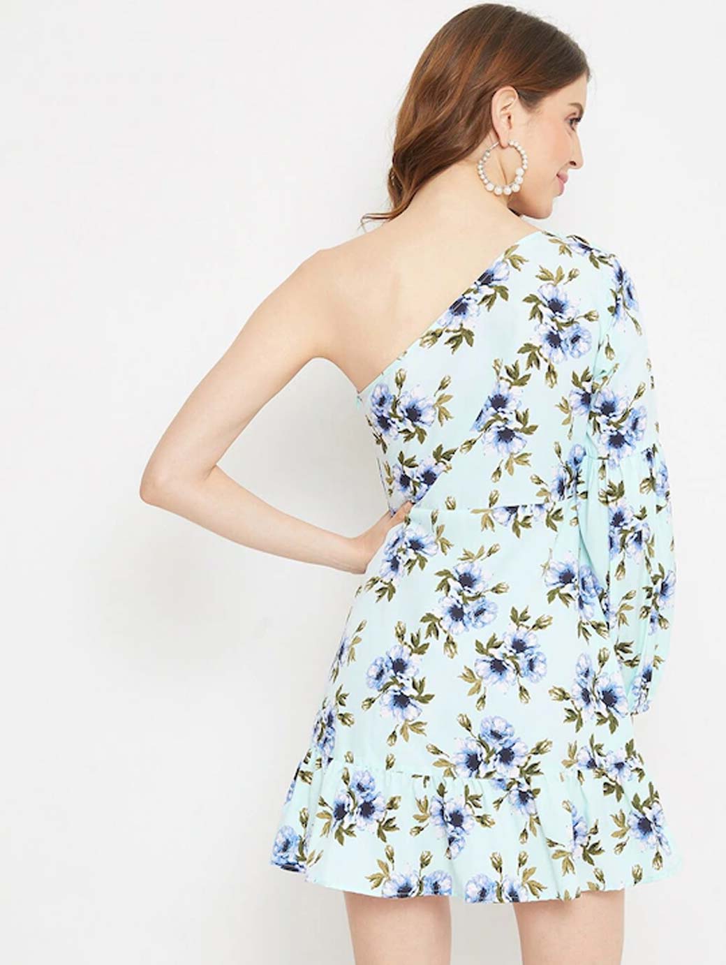 Green floral print wrap dress, One shoulder, Three-quarter, puff sleeve, Mini length in tulip hem, Crepe fabric, Concealed zip closure.