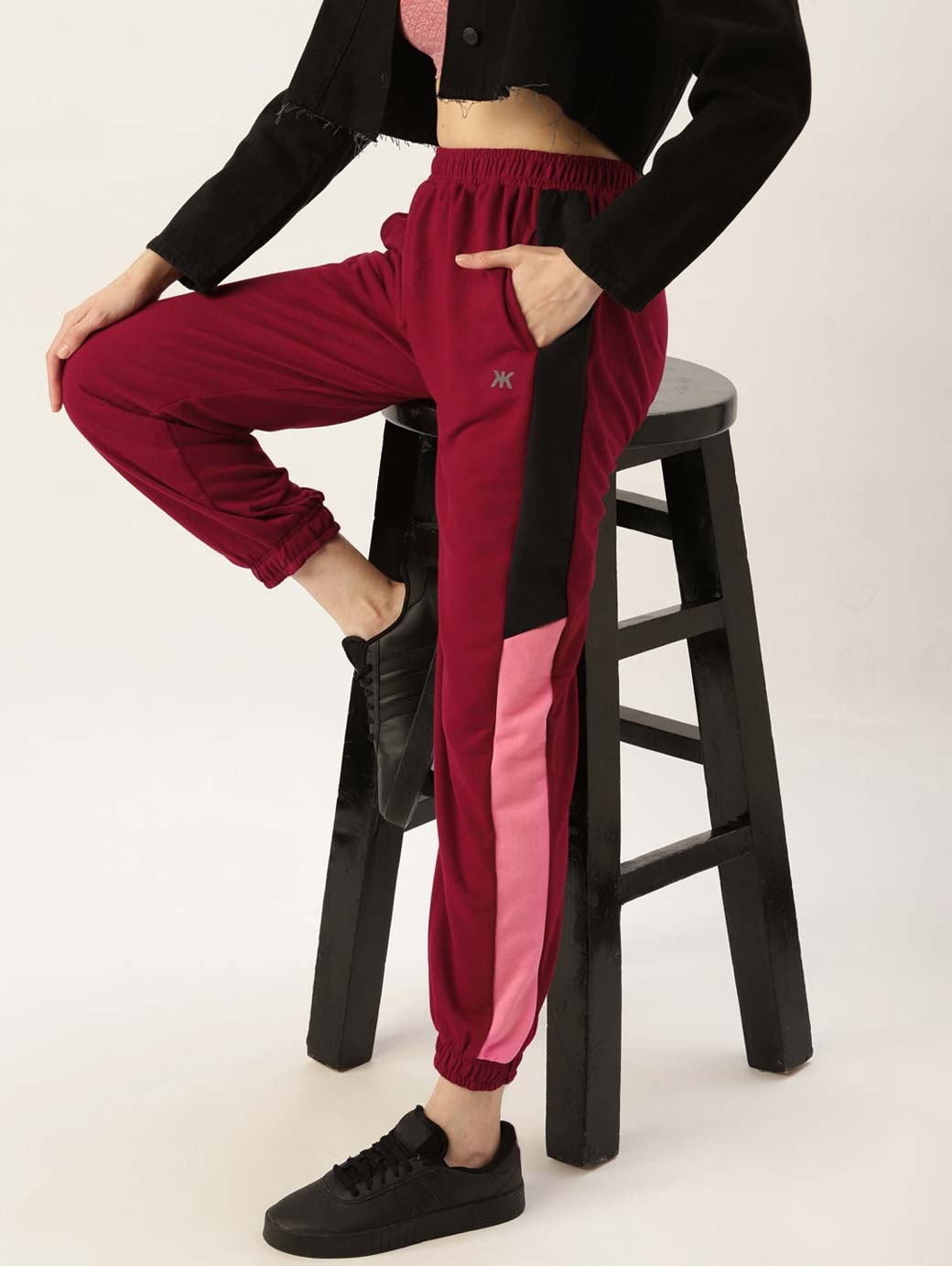 Maroon solid side striped joggers, has elasticated waistband with drawstring closure, 3 pockets and cuffed hem