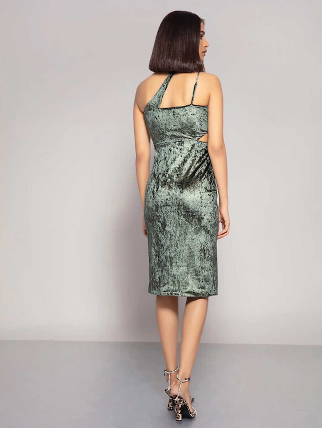Green embellished sheath dress, One shoulder neck, Sleeveless, Knee length in straight hem, Velvet fabric, Concealed zip closure.