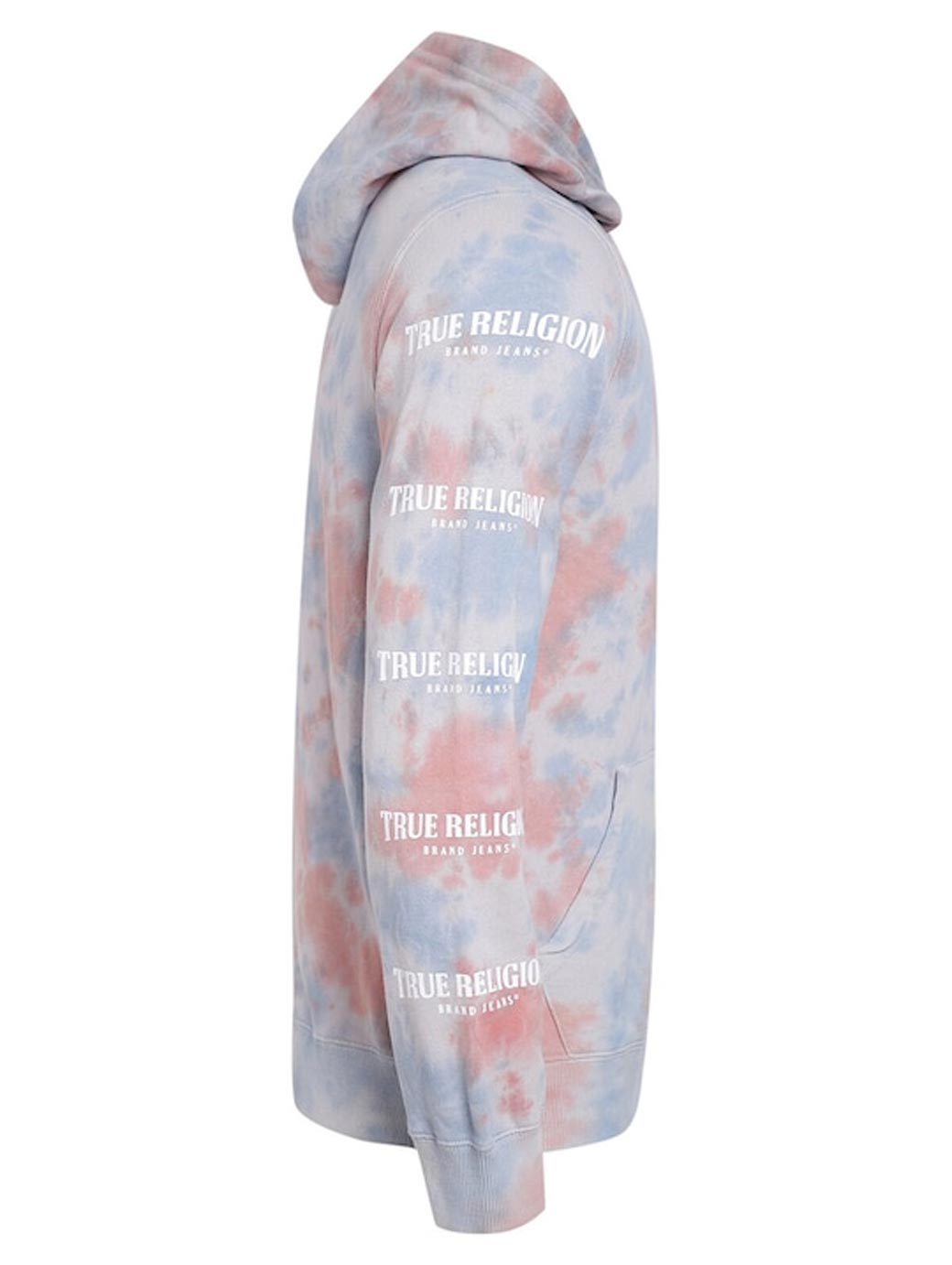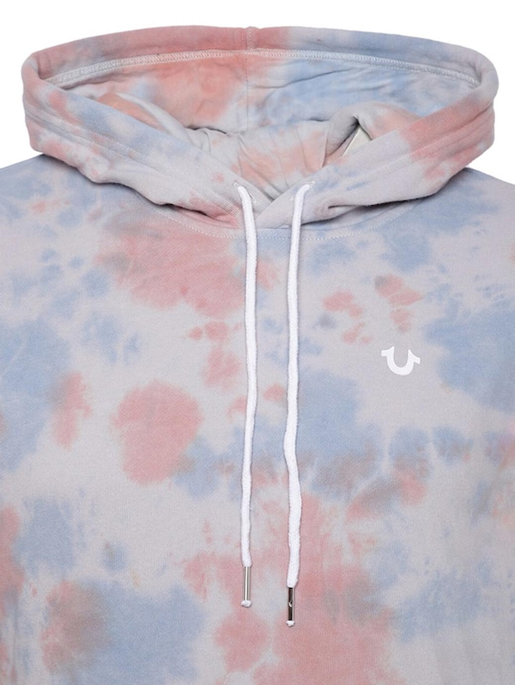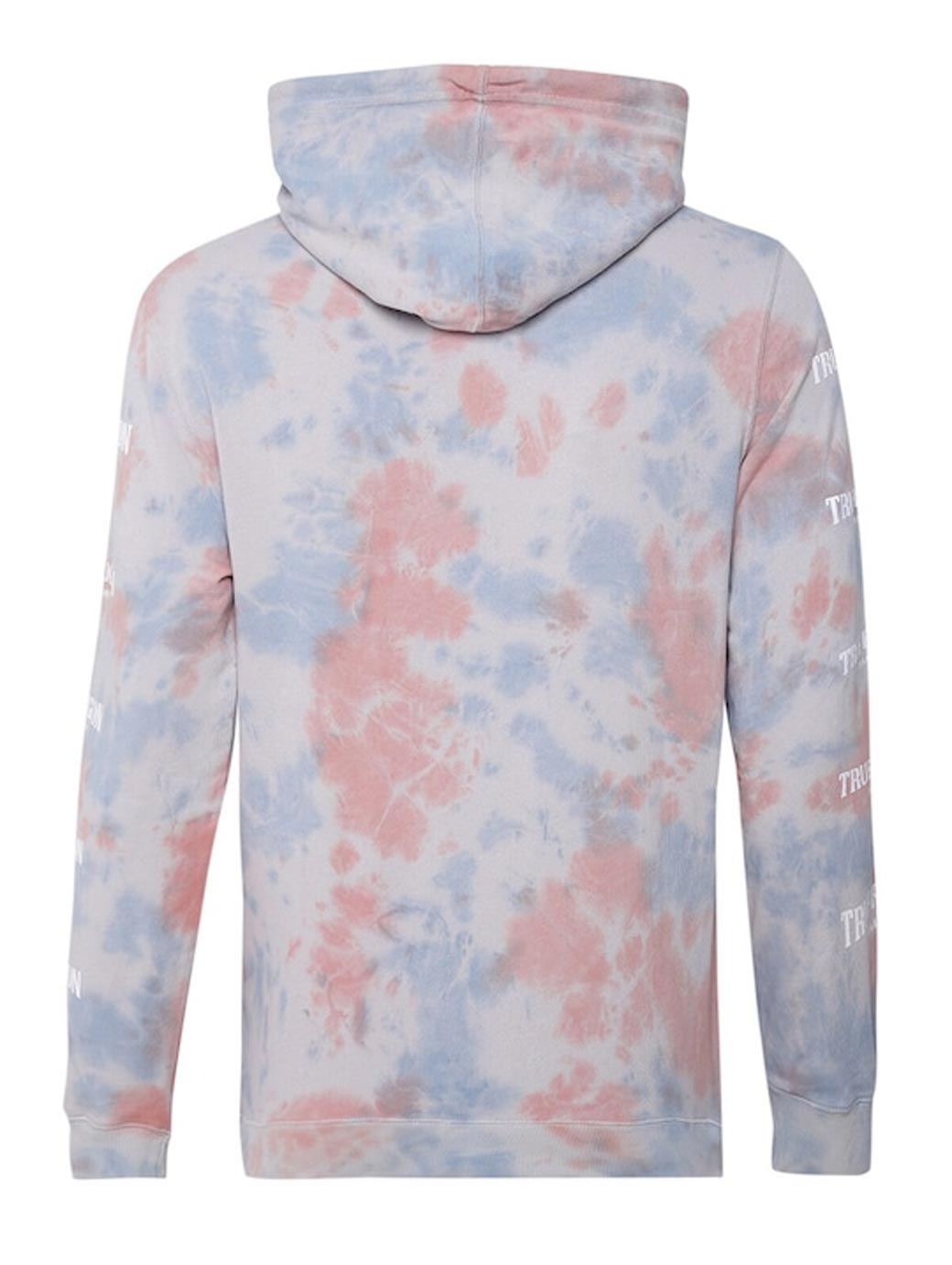 White printed sweatshirt has a hood, 2 insert pocket pockets, long sleeves, closure, ribbed hem