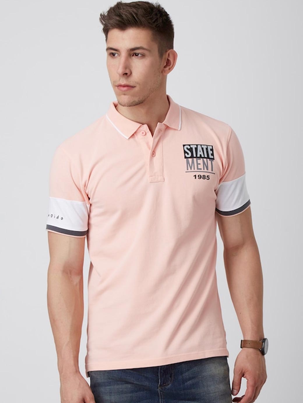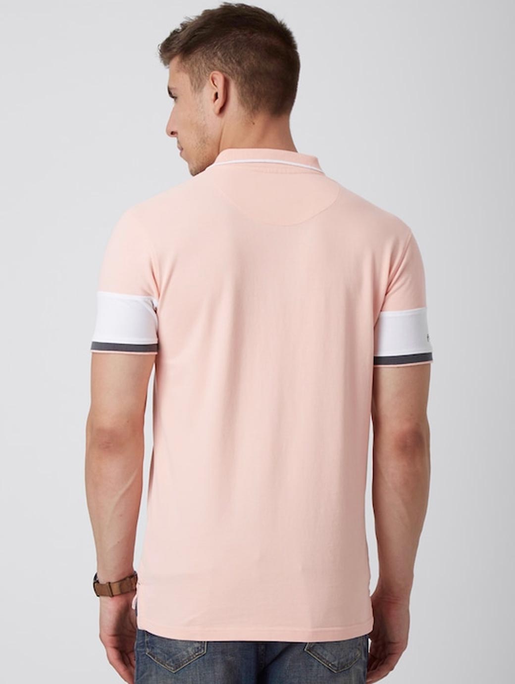 Pink solid T-shirt, has a polo collar, short sleeves.